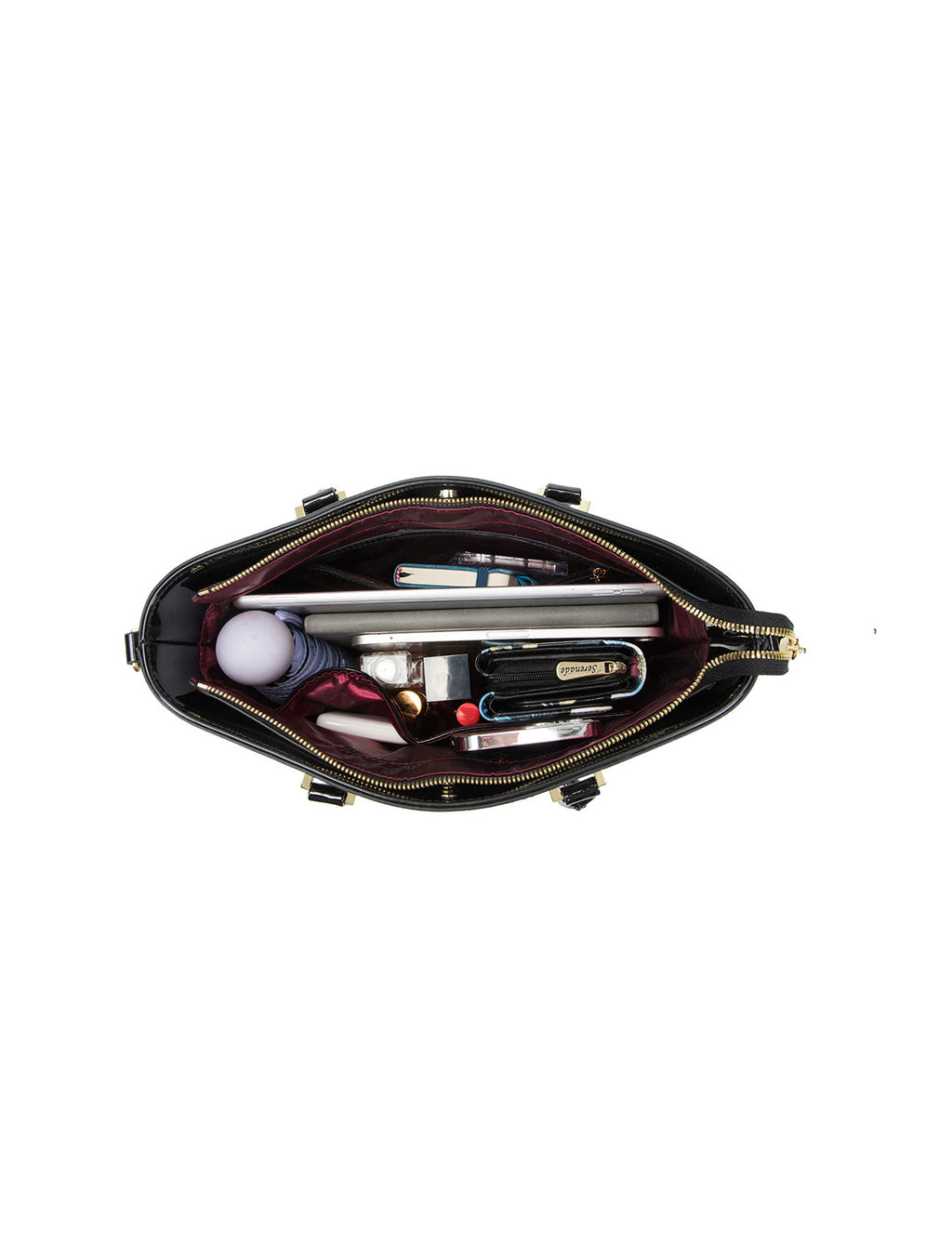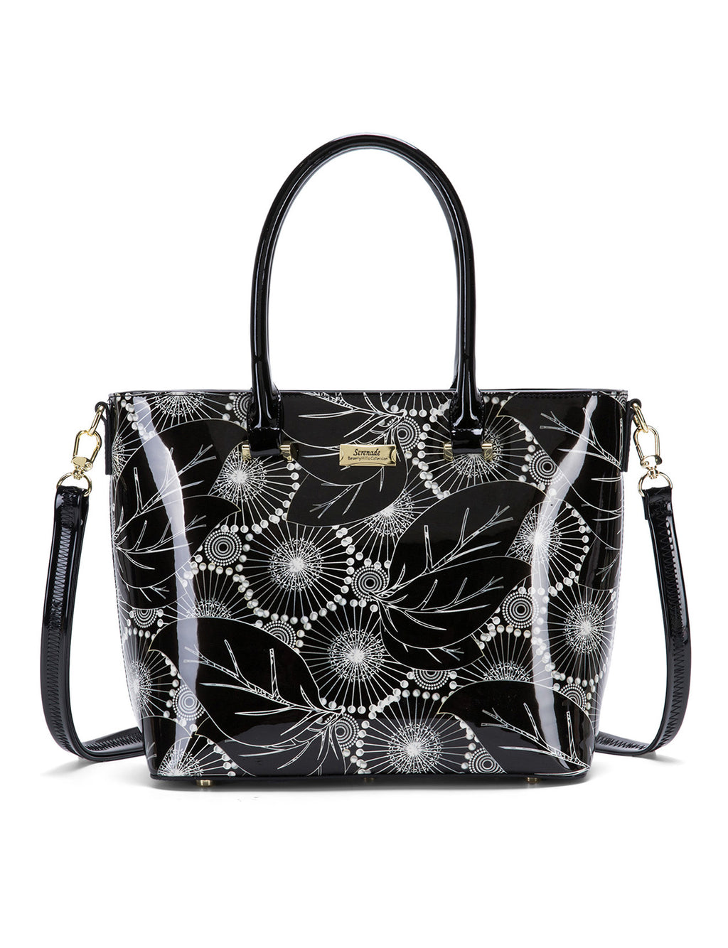 This Serenade Beverly Hills Collection Aspen Printed handbag is perfect for everyday. Genuine Leather with a patent finish, featuring one main zippered compartment and two magnetic snap closure compartments. The main compartment has an internal zippered compartment plus two pouches for your phone and other small items. With and an external zippered compartment on the back of the bag this bag is ideal for organising all your belongings.